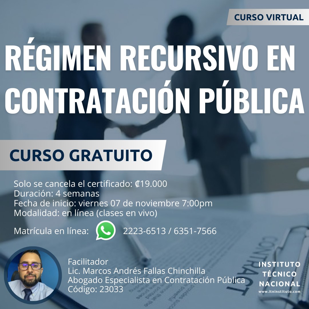Descripción del curso: La regulación de los recursos en contratación pública en Costa Rica está delimitada por la Ley General de Contratación Pública y su Reglamento, estableciendo un elenco taxativo de mecanismos de impugnación, para lo cual se deben analizar cada figura recursiva acorde al acto administrativo recurrible.