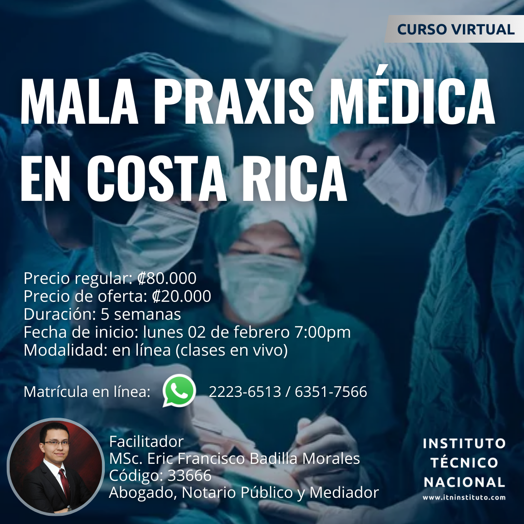 Descripción del curso: El curso titulado como "La Mala Praxis Médica en Costa Rica "está conformado por cinco lecciones magistrales, dirigido a abogados, profesionales en ciencias médicas y estudiantes, apasionados por la medicina forense, que quieran conocer a profundidad, las implicaciones legales como humanitarias, que una falta al deber de cuidado por parte de un médico, pueden provocar.